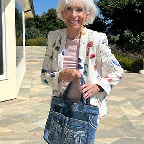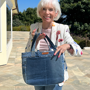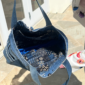Gorgeous denim tote. 16 inches wide x 12 inches tall. Hand-crafted by Dr. Laura.