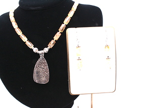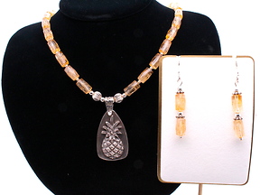 Carved citrine barrels. SS with beads, bail, clasp, and ear wire. Fine silver hand-crafted pendant. Hand-crafted by Dr. Laura.